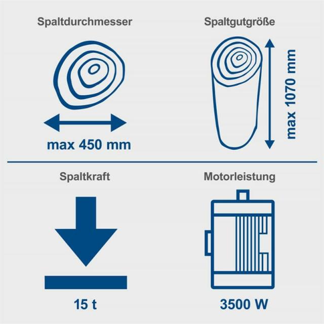 Scheppach Holzspalter Compact 15T, stehend, 400 V, 3500 W, inkl. Stammheber und Spaltgut-FangbügelInklusive Scheppach Elektro-Kettensäge CSE2700, 45,5 cm Schwertlänge, 2700 W Motor-Leistung, 2,7kWHighlights:Compact 15T Kraftvolle 15 T Spaltkraft Patentierte Spalttechnik – einziger Spalter Europas in der 15 T Klasse der Spaltgut in verschiedenen Arbeitshöhen spalten kann Durch den schwenkbaren Tisch besonders schnelles Arbeiten möglich GS Zertifiziert Leistungsstarker Motor max. 3500 W Besonders kompakt – für einfache Verstauung, nur 110 cm Maschinenhöhe im eingefahrenen Zustand Verwindungssteife und besonders kippsichere Konstruktion Mit Fangbügel und Stammheber für Spaltgut Spaltet Hart- und Weichholz bis 1070 mm Länge mühelos und zuverlässig Max. Spaltgutdurchmesser 450 mm 3 große Transporträder Vario Spalt System CSE2700 Kräftiger 2700 W Motor liefert gleichbleibende Leistung auch bei längerem Gebrauch 455 mm (18″ ) ProCut Schwert und Kette Leichte und kompakte Bauweise Werkzeugloser Kettenwechsel dank Schnellspannsystem Automatische Kettenschmierung Handschutz mit integrierter Systembremse Elektroantrieb ohne schädliche Abgase Serienmäßige Einschaltsperre verhindert ein unbeaufsichtigtes Anlaufen der Sägekette Ölzustandsanzeige mit Sichtfenster für einfache Kontrolle des Füllstandes Umlaufender Handgriff für vielseitige Einsatzmöglichkeiten Serienmäßig mit Kettenschutz zur sicheren Lagerung und Transport Zugentlastung für Verlängerungskabel Compact 15T Der Scheppach Compact 15t Holzspalter ist ein kraftvoller und zuverlässiger Helfer um Holzstämme komfortabel, schnell, sicher und kraftsparend zu Brennholz zu verarbeiten. Mit dem leistungsstarken 3500 Watt Motor und einer Spaltkraft von 15 Tonnen lässt sich selbst trockenes Hartholz mühelos spalten. Um den Rücken zu schonen, verfügt der Scheppach Holzspalter über einen Stammheber, der die schweren Stämme aufrichtet und diese mühelos auf der niedrigen Bodenplatte platziert werden können. Dank einer patentierten Spalttechnik kann mit dem Scheppach Compact 15t als einziger Holzspalter Europas in der Klasse 15 Tonnen Spaltgut in verschiedenen Arbeitshöhen spalten: Dank des integrierten, schwenkbaren Tischs stehen zwei Arbeitshöhen zur Verfügung: Stämme mit Maximallänge werden auf die Bodenplatte gestellt und können so auf Bodenniveau verarbeitet werden. Kleinere Stämme werden zur Verarbeitung einfach auf den erhöhten Tisch gestellt. Der Compact 15t spaltet dabei Stämme mit bis zu 1070 mm Länge und einem Durchmesser von 90 bis 450 mm gespalten werden. Der extra große Spaltkeil mit den Maßen 190 x 85 mm spaltet Hart- und Weichholz mühelos. Dank des Vario Spalt Systems sind verschiedene Holzgrößen kein Problem. Zum Betrieb benötigt der Scheppach Holzspalter einen 400 Volt Stromanschluss und ist dadurch besonders leistungsstark. Beim Hantieren mit schwerem Gerät ist die maximale Sicherheit des Benutzers eine Grundvoraussetzung: Der Compact 15t besteht aus einer verwindungssteifen, pulverbeschichteten Stahlkonstruktion und verfügt sowohl über eine Spaltgut-Fixiervorrichtung als auch über beidseitig platzierte Spaltgut-Fangbügel. Benutzen lässt sich das Gerät nur mittels Zwei-Hand-Bedienung. Der GS-zertifizierte Holzspalter entspricht dadurch aktuellsten Sicherheitsnormen. Der Compact 15t von Scheppach ist kompakt gebaut und lässt sich mit nur 108 cm Maschinenhöhe in eingefahrenem Zustand besonders leicht verstauen. Ein Eigengewicht von 185,5 kg sowie ein integrierter Kippschutz sorgen stets für einen sicheren Stand des Holzspalters. Dank der drei großen Transporträder lässt sich der Compact 15t dennoch gut transportieren. CSE2700 Mit ihrer zuverlässigen Leistung rund um Haus und Garten überzeugt die Scheppach Elektro-Kettensäge. Ein schneller Start, der reibungslose Kettenlauf und die leichte Bauweise machen das Arbeiten mit der CSE2700 zum Kinderspiel.